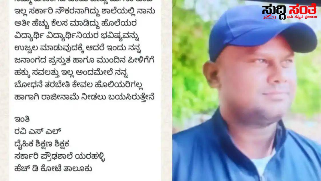 ಕರ್ನಾಟಕ ರಾಜ್ಯ ಪರಿಶಿಷ್ಟ ಜಾತಿ ಎಡಗೈ ಜಿಲ್ಲಾ ನೌಕರರ ಸಂಘದ ವಾಟ್ಸಪ್ ಗ್ರೂಪ್ನಲ್ಲಿ ಸಂದೇಶ ಕಳುಹಿಸಿದ್ದ ಶಿಕ್ಷಕ ರವಿ, ‘ಕಳೆದ 18 ವರ್ಷಗಳಿಂದ ಸರ್ಕಾರಿ ಶಾಲೆ ಯಲ್ಲಿ ಸೇವೆ ಸಲ್ಲಿಸುತ್ತಿದ್ದು, ರಾಜ್ಯ ಮಟ್ಟದ ಕ್ರೀಡಾ ಸ್ಪರ್ಧೆಗಳಲ್ಲಿ ವಿದ್ಯಾರ್ಥಿಗಳಿಗೆ ಪ್ರಶಸ್ತಿಗಳನ್ನು ತಂದು ಕೊಟ್ಟಿದ್ದೇನೆ. ಆದರೆ, ತಮ್ಮ ಶಾಲೆಯಲ್ಲಿ ಎಡಗೈ ಸಮುದಾಯದ ಒಬ್ಬರೂ ವಿದ್ಯಾರ್ಥಿಗಳಿಲ್ಲದಿರುವುದು ಮನಸ್ಸಿಗೆ ನೋವು ತಂದಿದ್ದು
