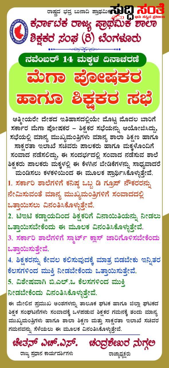 ಮಕ್ಕಳ ದಿನಾಚರಣೆ ಪ್ರಯುಕ್ತ ರಾಜ್ಯದ ಎಲ್ಲಾ ಶಾಲೆ-ಕಾಲೇಜುಗಳಲ್ಲಿ ನವೆಂಬರ್ 14 ರಂದು ರಾಜ್ಯದ ಎಲ್ಲಾ ಸರ್ಕಾರ ಶಾಲೆಗಳಲ್ಲಿ ಪೋಷಕ-ಶಿಕ್ಷಕರ ಸಭೆ ಕಡ್ಡಾಯ ಗೊಳಿಸಿ ಶಿಕ್ಷಣ ಇಲಾಖೆ ಆದೇಶ ಹೊರಡಿಸಿದೆ.