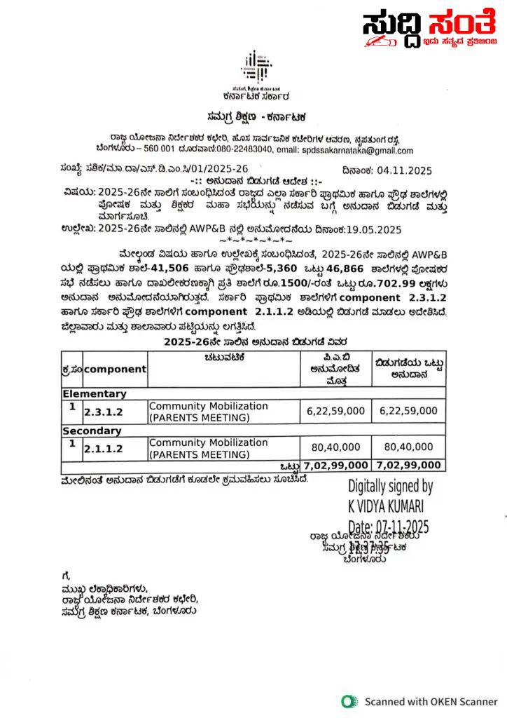 ಮೇಲ್ಕಂಡ ವಿಷಯ ಹಾಗೂ ಉಲ್ಲೇಖಕ್ಕೆ ಸಂಬಂಧಿ ಸಿದಂತೆ, 2025-26ನೇ ಸಾಲಿನಲ್ಲಿ AWP&B ಯಲ್ಲಿ ಪ್ರಾಥಮಿಕ ಶಾಲೆ-41,506 ಹಾಗೂ ಪ್ರೌಢಶಾಲೆ-5,360 ಒಟ್ಟು 46,866 ಶಾಲೆಗಳಲ್ಲಿ ಪೋಷಕರ ಸಭೆ ನಡೆಸಲು ಹಾಗೂ ದಾಖಲೀಕರಣಕ್ಕಾಗಿ ಪ್ರತಿ ಶಾಲೆಗೆ ರೂ.1500/-ರಂತೆ ಒಟ್ಟು ರೂ.702.99 ಲಕ್ಷಗಳು ಅನುದಾನ ಅನುಮೋದನೆಯಾಗಿರುತ್ತದೆ.