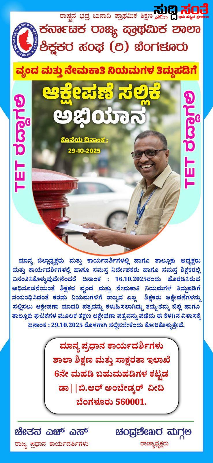 ಆಕ್ಷೇಪಣೆ ಸಲ್ಲಿಸಲು ಅಕ್ಟೋಬರ್ 29 ರಂದು ಕೊನೆಯ ದಿನವಾಗಿದ್ದು ಈ ಒಂದು ಹಿನ್ನಲೆಯಲ್ಲಿ ಈ ಕೂಡಲೇ ಶಿಕ್ಷಕರು ಈ ಒಂದು ವಿಚಾರಕ್ಕೆ ಆಕ್ಷೇಪಣೆ ಸಲ್ಲಿಸುವಂತೆ ಹೇಳಿದ್ದಾರೆ.ಈ ಕೂಡಲೇ ಶಿಕ್ಷಕರು ಆಕ್ಷೇಪಣಾ ಮಾದರಿ ಪತ್ರಗಳನ್ನು ತಗೆದುಕೊಂಡು ಶಾಲಾ ಶಿಕ್ಷಣ ಮತ್ತು ಸಾಕ್ಷರತಾ ಇಲಾಖೆಯ ಪ್ರಧಾನ ಕಾರ್ಯದರ್ಶಿ ಯವರಿಗೆ ಸಲ್ಲಿಸುವಂತೆ ರಾಜ್ಯಾಧ್ಯಕ್ಷರಾರಿಗಿರುವ ಚಂದ್ರಶೇಖರ ನುಗ್ಗಲಿ ಯವರು ಕರೆ ನೀಡಿದ್ದಾರೆ.