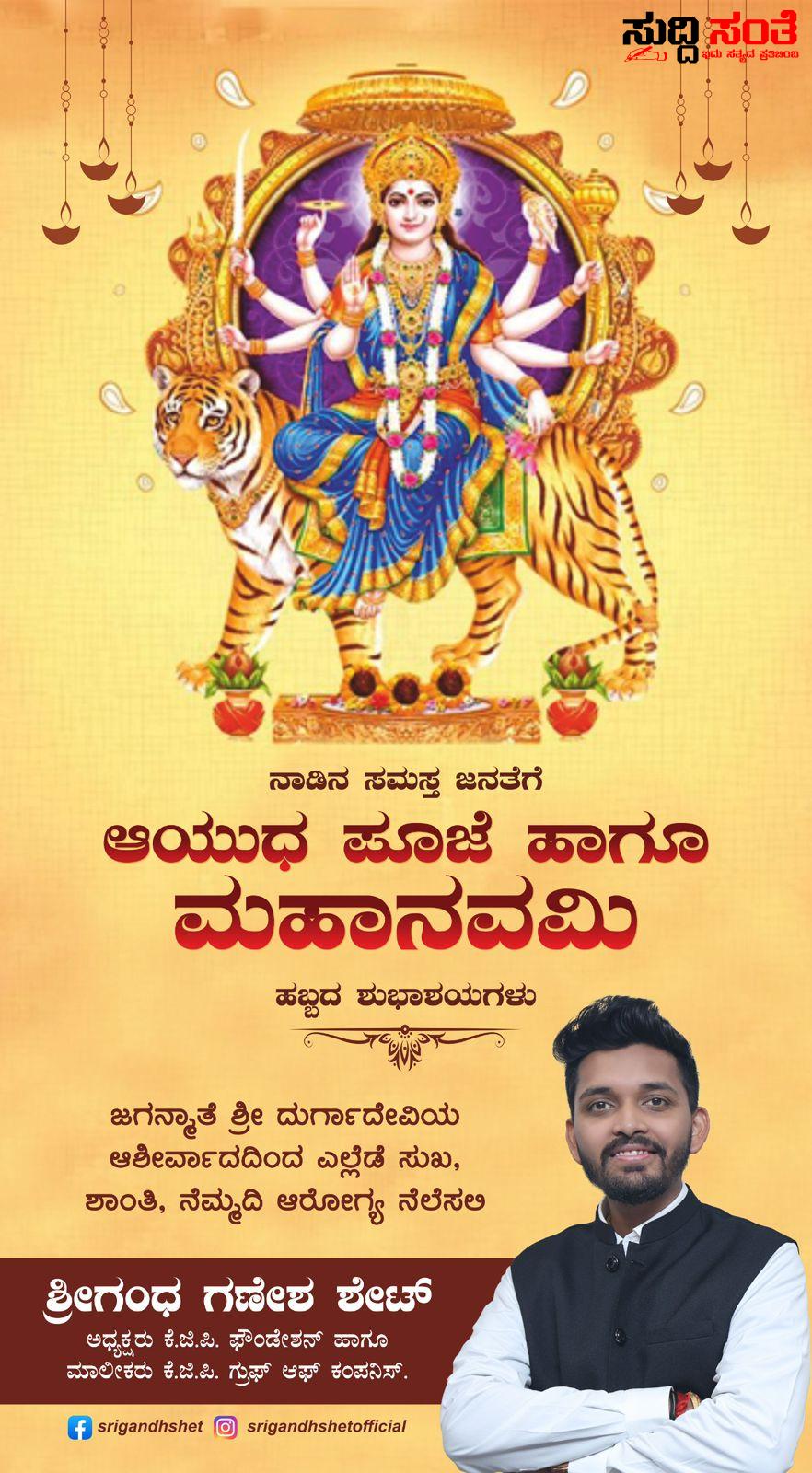 ದೇಶದ ಎಲ್ಲೆಡೆ ನವರಾತ್ರಿ ಹಬ್ಬದ ಸಡಗರ ಸಂಭ್ರಮ ಆರಂಭವಾಗಿದ್ದು ಎಲ್ಲರೂ ಕೂಡಾ ಹಬ್ಬದ ಆಚರಣೆ ಯಲ್ಲಿ ತೊಡಗಿದ್ದು ಇನ್ನೂ ಈ ಒಂದು ಹಬ್ಬದ ಹಿನ್ನೆಲೆ ಯಲ್ಲಿ ಹುಬ್ಬಳ್ಳಿಯ ಯುವ ಉಧ್ಯಮಿ ಕೆಜಿಪಿ ಗ್ರೂಪ್ ಆಫ್ ಕಂಪನಿಸ್ ಮಾಲೀಕ ರಾಗಿರುವ ಶ್ರೀಗಂಧ ಶೇಟ್ ಅವರು ಹುಬ್ಬಳ್ಳಿ ಧಾರವಾಡ ಜಿಲ್ಲೆಯ ಮತ್ತು ನಾಡಿನ ಜನತೆಗೆ ಹಬ್ಬದ ಶುಭಾಶಯಗಳನ್ನು ಕೋರಿದ್ದಾರೆ