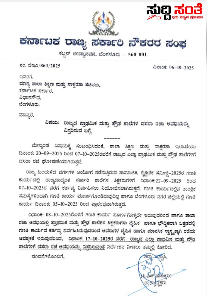 ದಸರಾ ರಜೆ ವಿಸ್ತರಣೆ ಮಾಡಿ ರಾಜ್ಯ ಸರ್ಕಾರಿ ನೌಕರರ ಸಂಘ ಒತ್ತಾಯ – ಶಿಕ್ಷಣ ಸಚಿವರಿಗೆ,ರಾಜ್ಯ ಸರ್ಕಾರದ CS ಗೆ ಪತ್ರ ಬರೆದ ರಾಜ್ಯಾಧ್ಯಕ್ಷರು…..ರಜೆ ವಿಸ್ತರಣೆಯ ನಿರೀಕ್ಷೆಯಲ್ಲಿ ರಾಜ್ಯದ ಶಿಕ್ಷಕರು…..