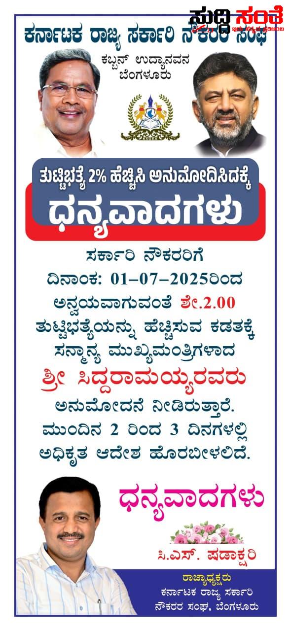 ರಾಜ್ಯ ಸರ್ಕಾರಿ ನೌಕರರಿಗೆ ಶೇ.2 ತುಟ್ಟಿಭತ್ಯೆಯನ್ನು ಹೆಚ್ಚಿಸುವ ಕಡತಕ್ಕೆ ಸಿಎಂ ಸಿದ್ದರಾಮಯ್ಯ ಅವರು ಅನುಮೋದನೆ ನೀಡಿರುವ ಹಿನ್ನೆಲೆಯಲ್ಲಿ ಕರ್ನಾಟಕ ರಾಜ್ಯ ಸರ್ಕಾರಿ ನೌಕರರ ಸಂಘದ ಅಧ್ಯಕ್ಷ ಸಿ.ಎಸ್. ಷಡಾಕ್ಷರಿ ಅವರು ರಾಜ್ಯ ಸರ್ಕಾರಕ್ಕೆ ಧನ್ಯವಾದ ಸಲ್ಲಿಸಿದ್ದಾರೆ.