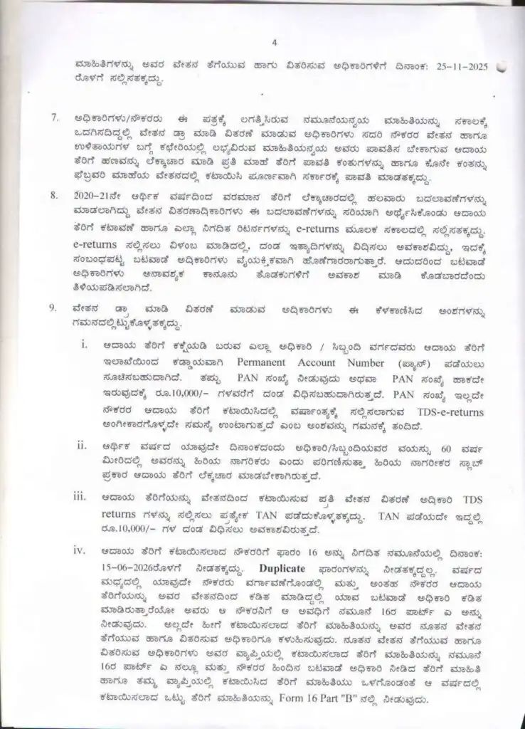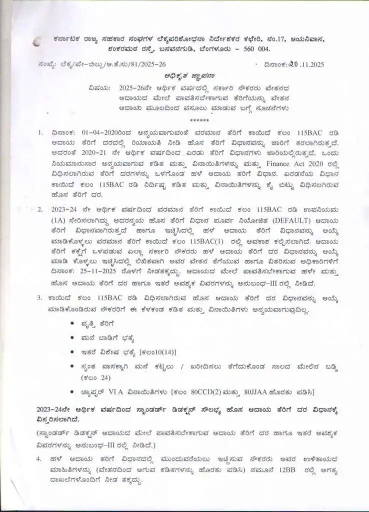 ಆದಾಯ ತೆರಿಗೆ ಪಾವತಿ ಮಾಡುವ ಕುರಿತು ರಾಜ್ಯ ಸರ್ಕಾರಿ’ ನೌಕರರೇ ಗಮನಿಸಿ ಆದಾಯ ತೆರಿಗೆ ಪಾವತಿ’ ಕುರಿತು ಇಲ್ಲಿದೆ ಸಂಪೂರ್ಣ ಮಾಹಿತಿ ಹೌದು 2025-26ನೇ ಆರ್ಥಿಕ ವರ್ಷದಲ್ಲಿ ಸರ್ಕಾರಿ ನೌಕರರು ವೇತನದ ಆದಾಯದ ಮೇಲೆ ಪಾವತಿಸ ಬೇಕಾಗುವ ತೆರಿಗೆಯನ್ನು ವೇತನ ಆದಾಯ ಮೂಲದಿಂದ ವಸೂಲು ಮಾಡುವ ಬಗ್ಗೆ ಸೂಚನೆಗಳನ್ನ ನೀಡಿದೆ.