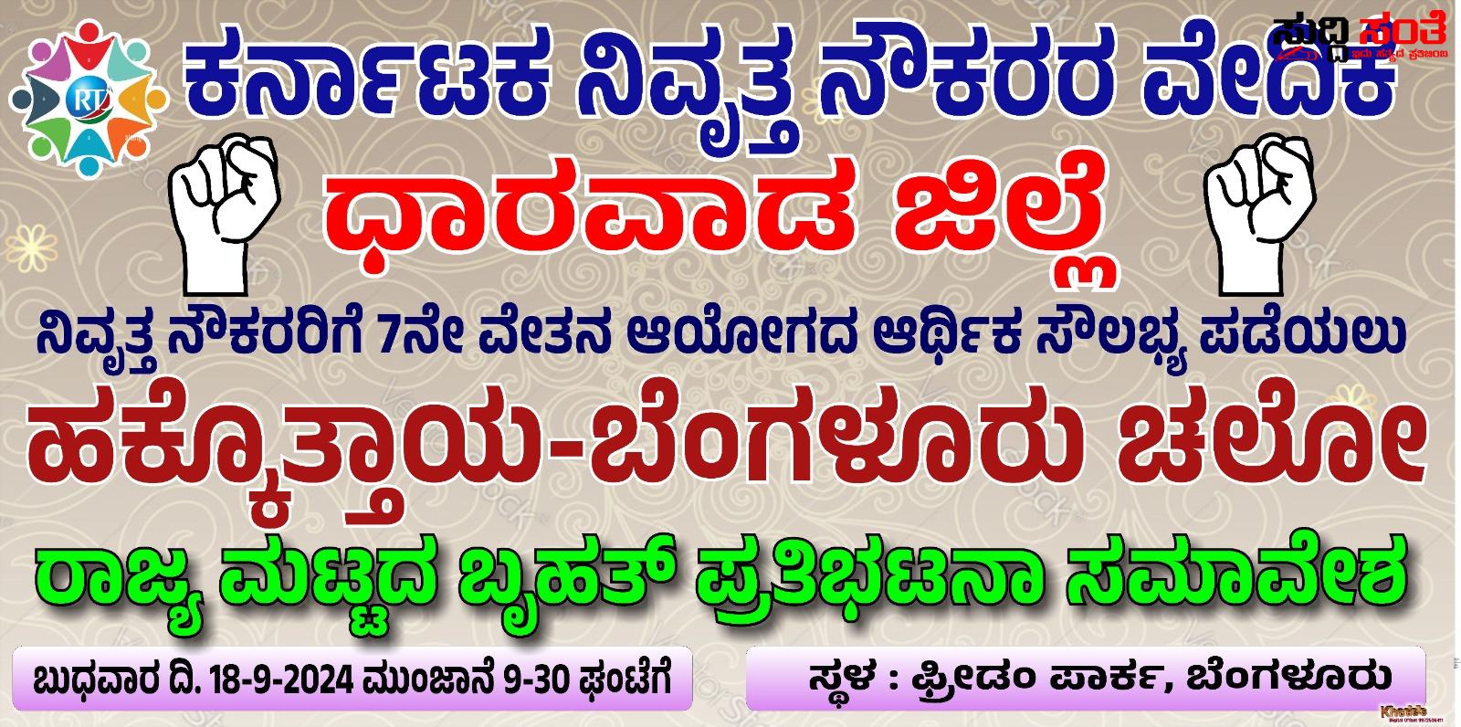 ಎಚ್ಚೆತ್ತುಕೊಂಡು ಈ ಒಂದು ಹೋರಾಟಕ್ಕೆ ಇಳಿದಿರು ವುದು ಸಮಯೋಚಿತವಾಗಿದೆ, ಸೂಕ್ತ ವಾಗಿದೆ ಒಗ್ಗಟ್ಟಿನಿಂದ ಹಕ್ಕೊತ್ತಾಯ ಪ್ರದರ್ಶಿಸಬೇಕಿದೆ ಆದ್ದರಿಂದ ರಾಜ್ಯ ನಿವೃತ್ತ ನೌಕರರ ವೇದಿಕೆ ಬೆಂಗಳೂರಿನ ಫ್ರೀಡಂ ಪಾರ್ಕ್ ನಲ ದಿನಾಂಕ ೧೮.೦೯.೨೦೨೪ ರಂದು ಮುಂಜಾನೆ ೯.೩೦ ಗಂಟೆಯಿಂದ ಪ್ರಾರಂಭವಾಗುವ ಬೃಹತ್ ಪ್ರತಿಭಟನಾ ಸಮಾವೇಶಕ್ಕೆ ಹಾಜರಾಗಿ