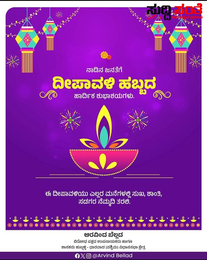 ನಾಡಿನ ಜನತೆಗೆ ಬೆಳಕಿನ ಹಬ್ಬ ದೀಪಾಳಿಯ ಶುಭಾಶಯ ಕೋರಿದ ಶಾಸಕ ಅರವಿಂದ ಬೆಲ್ಲದ – ಎಲ್ಲರ ಮನೆಗಳಲ್ಲಿ ಸುಖ,ಶಾಂತಿ,ಸಡಗರ ನೆಮ್ಮದಿ ಯನ್ನು ತರಲಿ ಎಂದು ಶುಭ ಹಾರೈಸಿದ ವಿರೋಧ ಪಕ್ಷದ ಉಪನಾಯಕ ಅರವಿಂದ ಬೆಲ್ಲದ…..